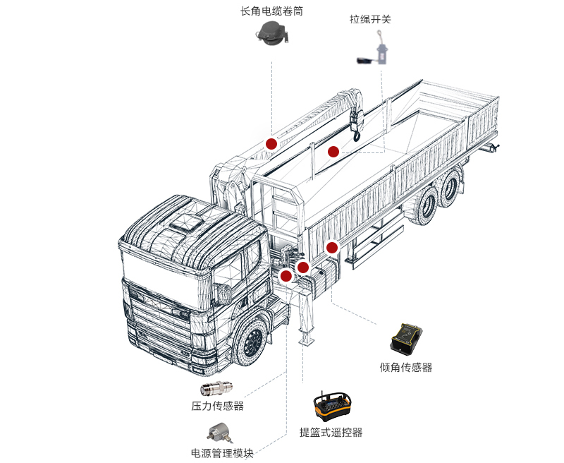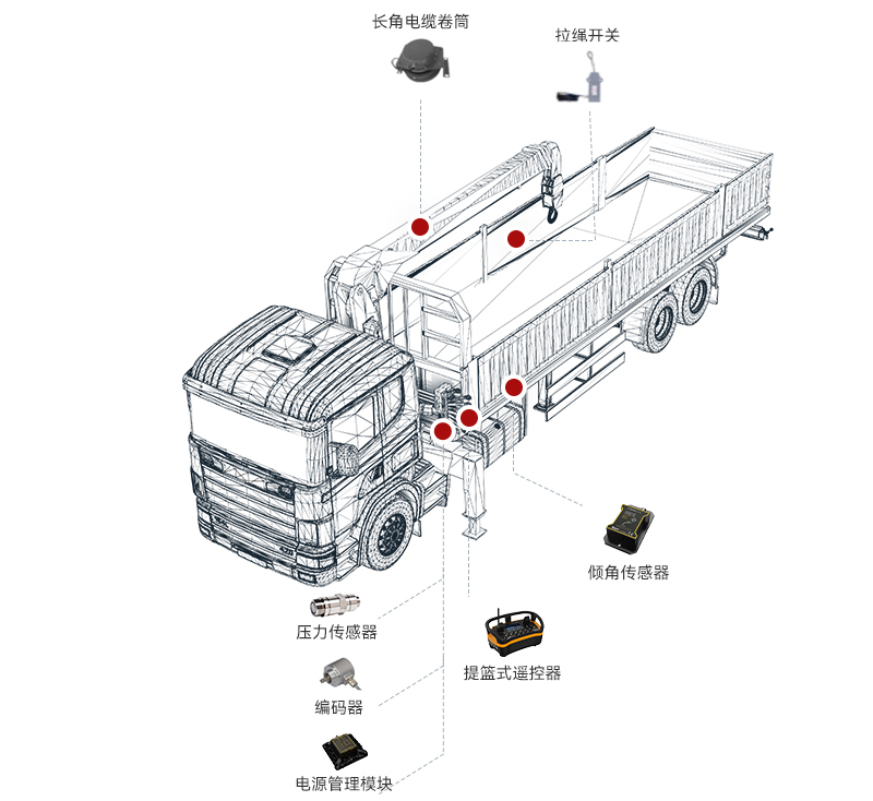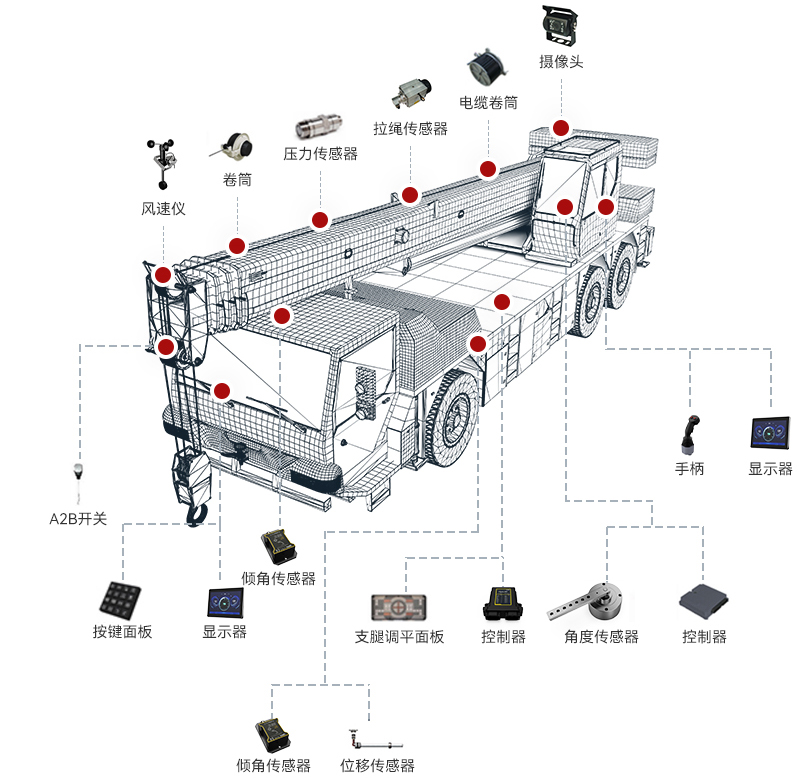 支持轉(zhuǎn)臺回轉(zhuǎn)控制、高度限位控制、變幅和卷揚控制。