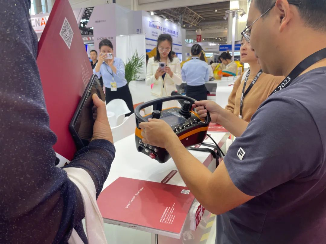 無人化也是本次展會(huì)的核心之一,在展臺(tái)另一側(cè),多款無線遙控設(shè)備也得到了客戶的廣泛關(guān)注。eTelecom系列遙控系統(tǒng),發(fā)射器面板可根據(jù)客戶的功能需求進(jìn)行非標(biāo)定制,面板可以安裝單軸遙控、雙軸遙控、電位計(jì)、選擇開關(guān)、撥動(dòng)開關(guān)等。不僅品質(zhì)可靠,并且采用符合人體力學(xué)的腰跨式設(shè)計(jì),在工程機(jī)械、林業(yè)機(jī)械、港口機(jī)械等領(lǐng)域廣泛應(yīng)用。